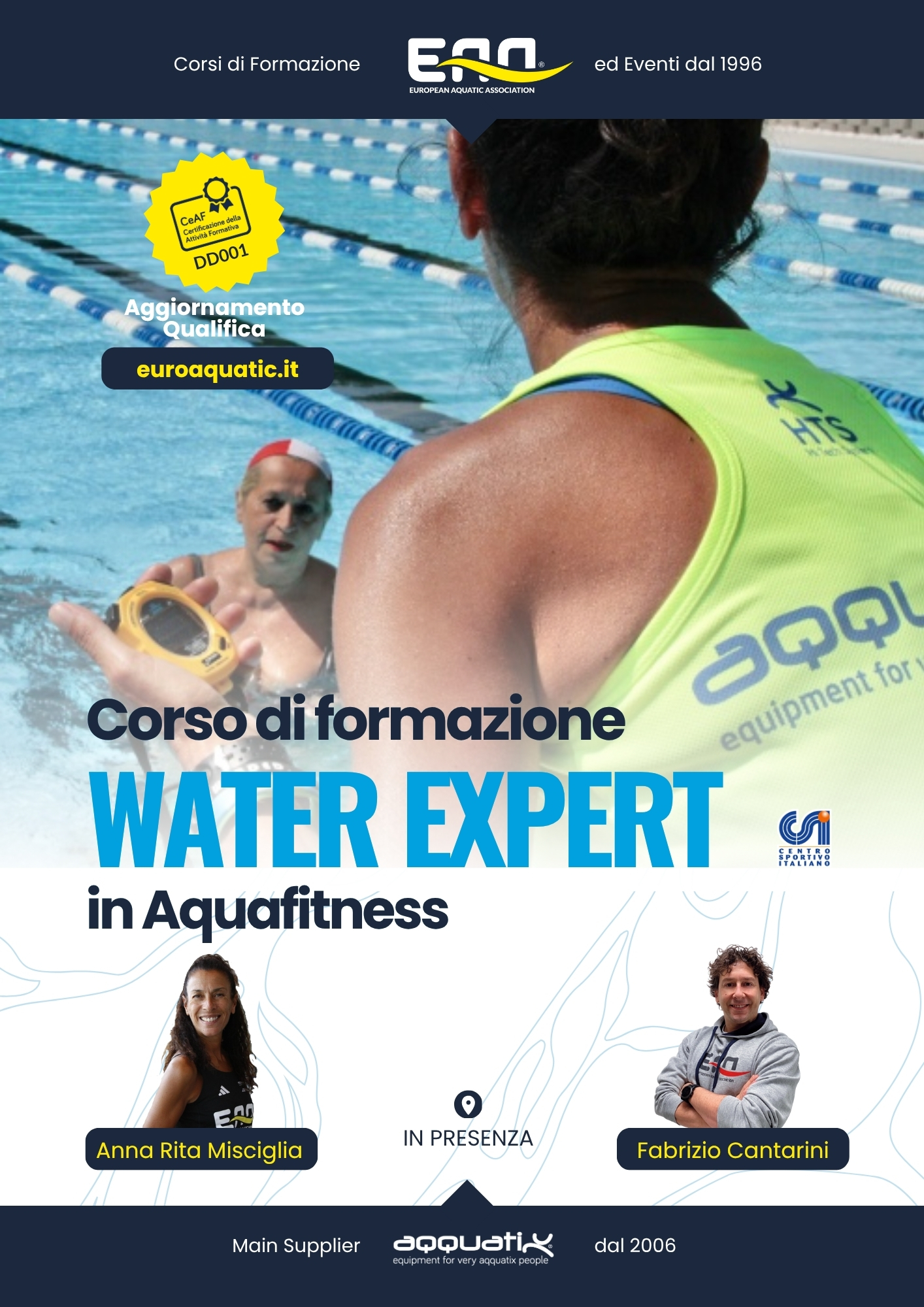 Il corso WATER EXPERT in AQUAFITNESS è conclusione del percorso formativo di aquafitness altamente performante, frutto della ultra ventennale ricerca ed esperienza di EAA, sostenuta dal Direttore Scientifico, coadiuvata dal Comitato Tecnico e supportata dai migliori professionisti internazionali di tale area.